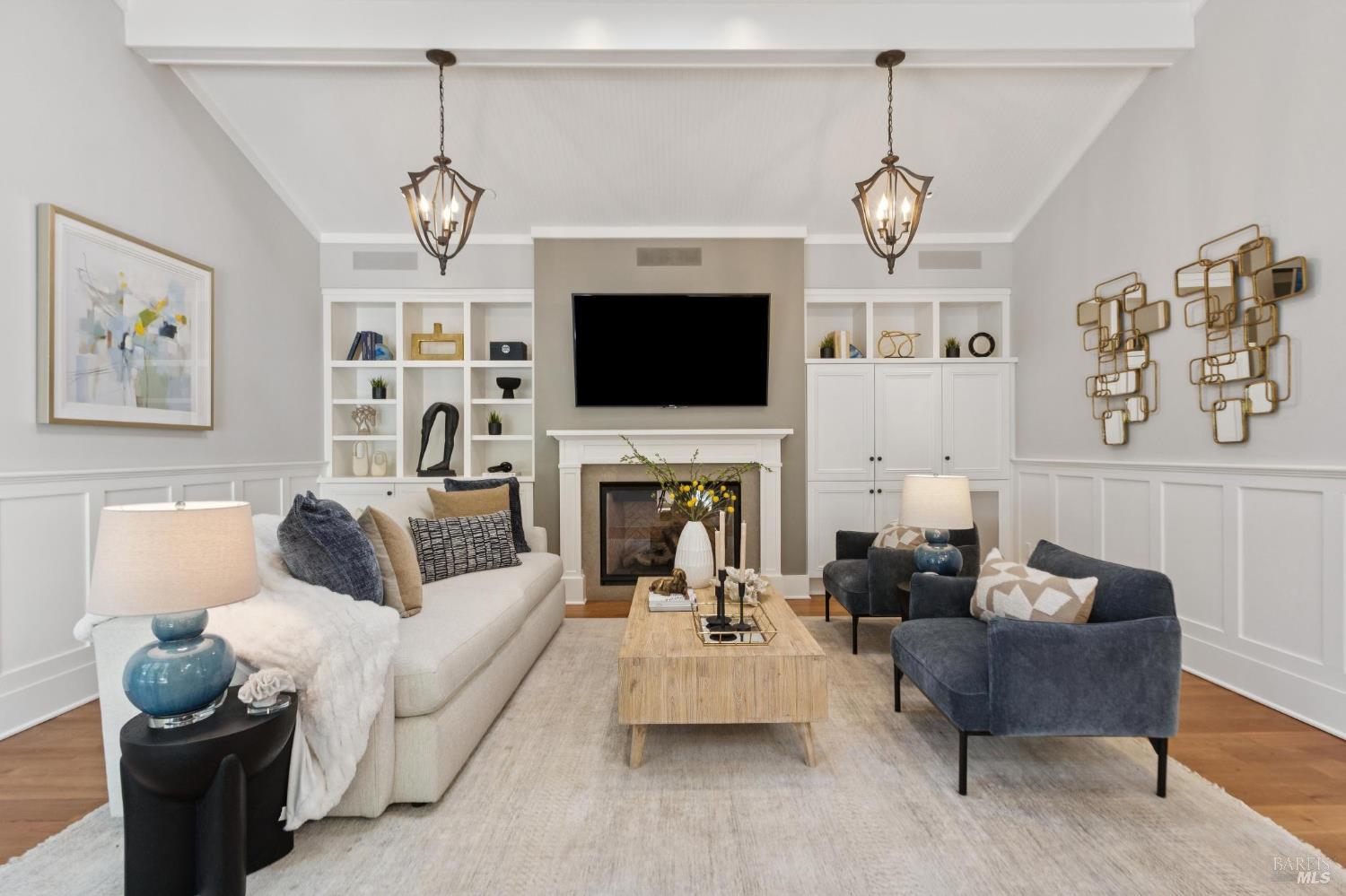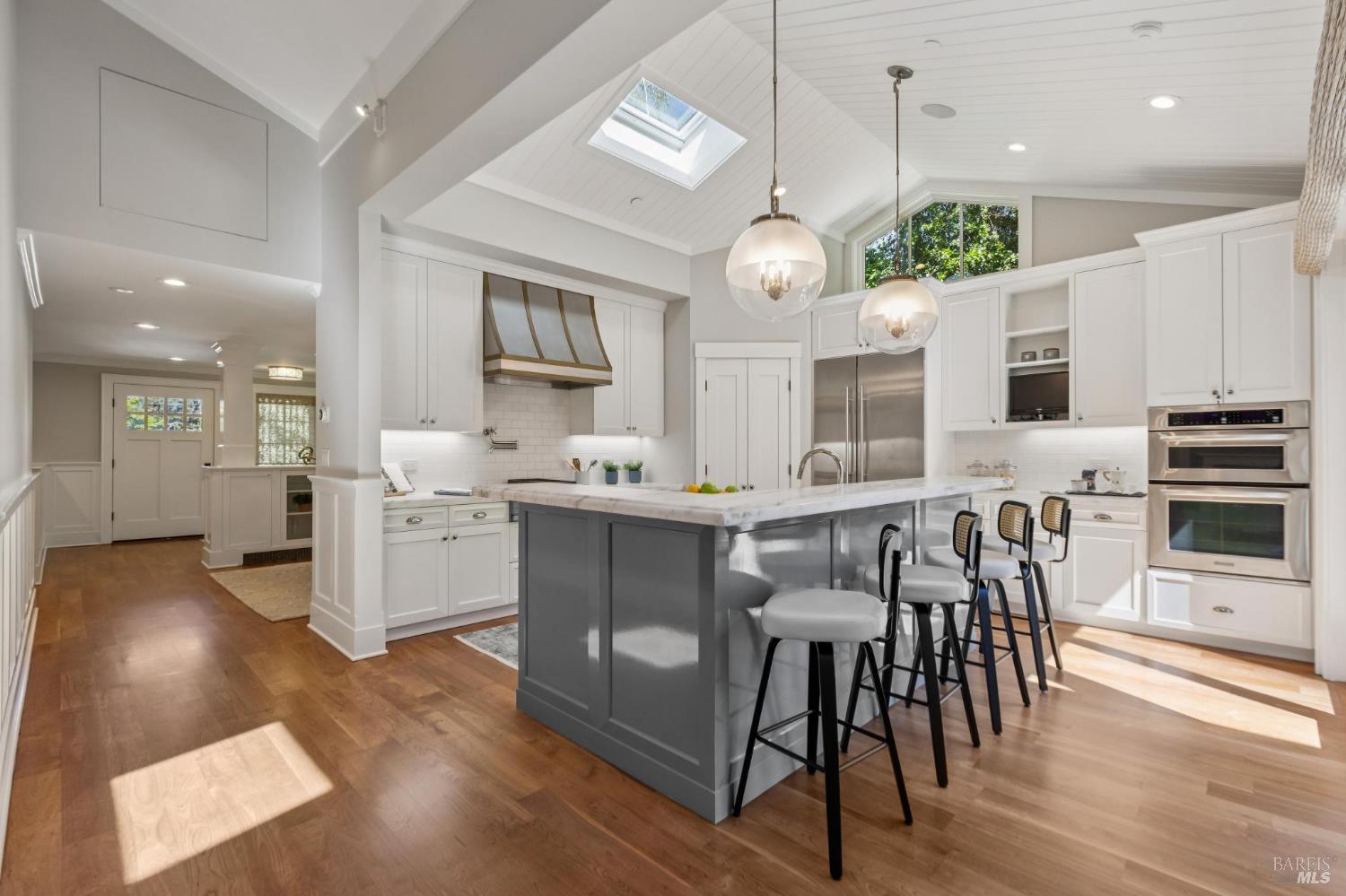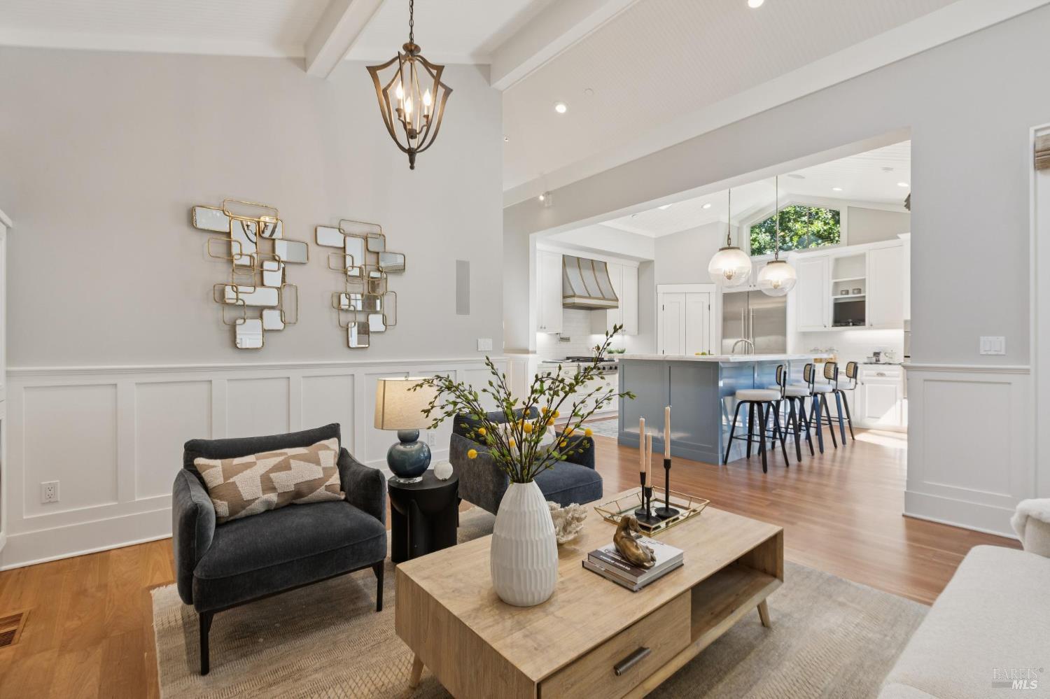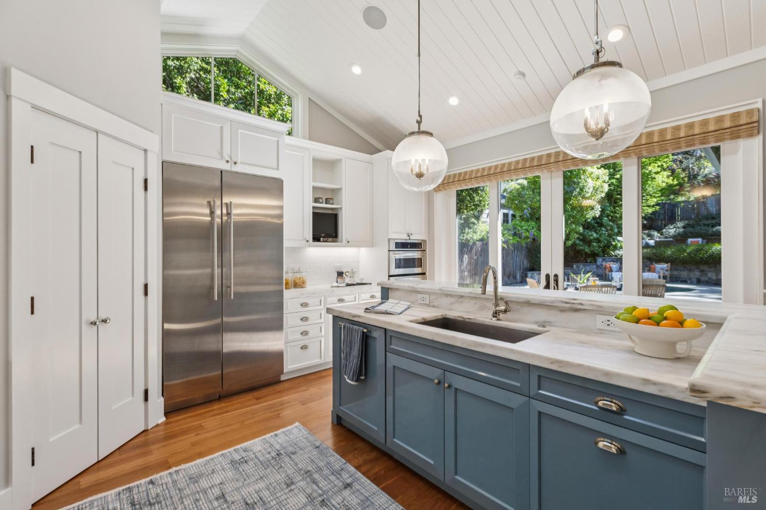 Never before has there been a home with this combination of timeless style, high quality, prime location and the opportunity to have more fun than you can imagine in your own backyard. Stepping into this home you are immediately impressed by soothing paint colors, the rich details of the wainscoting, built in cabinets and soaring ceilings with shiplap details. This is a home where you just feel good and you know that love and happiness is in your future here. The chef's kitchen features chunky marble countertops that feel like they will last a millennium, stainless steel appliances and an eat-in center island to gather around. All of this connects seamlessly with a soaring ceiling family room with built in entertainment system, and also opens to the fabulous and private back yard. This is where the fun begins with a glistening pool, a muli-use sport court, an outdoor kitchen, and multiple moment areas to enjoy with friends and family. You can look forward to making years of memories in this incredibly special one-of-a-kind back yard. The primary suite is blow you away gorgeous, featuring soaring ceilings, large sliders to access the yard, a walk-in closet, and a spa like bathroom that Ceasar would envy. On this same level are two generous bedrooms, a charming dual sink hall bathroom and wow! level powder room. Downstairs is a cozy fourth bedroom which is perfect for guests, an au pair, a home office, or a teenager's lair. Wine lovers will delight in the wine storage area next to the laundry room. No need to worry about high energy bills as this home offers solar, two Tesla power-wall batteries in the spacious two car garage and a new high efficiency furnace, not to mention A/C for those dog days of summer heat. This stunning home is located just blocks from coveted downtown Larkspur offering wonderful dining and shopping opportunities. Award winning schools, trail access to Mt. Tam and a welcoming community neighborhood make this a 10 out of 10 home that you won't want to miss.